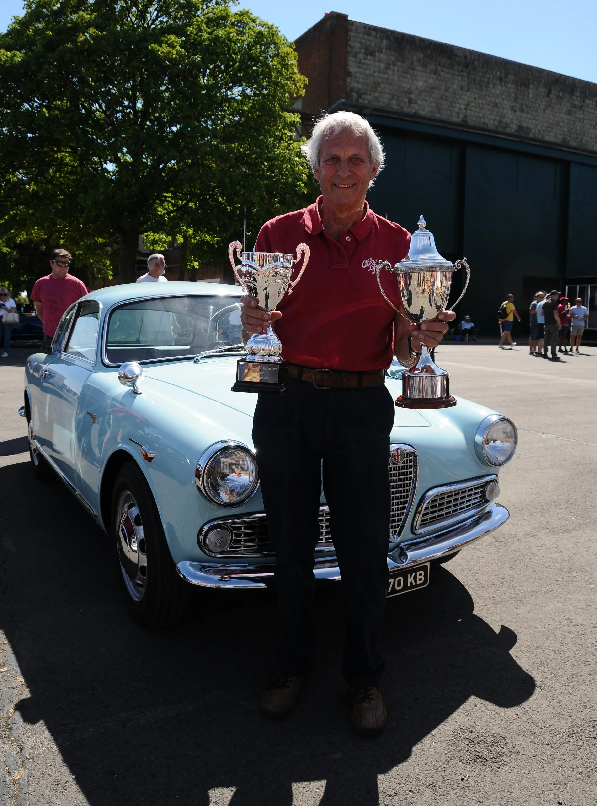 Richard Wigley won “best in class” and the top “best in show” in the prestigious UK National Alfa Day Concours event held at Bicester Heritage on 7 August. Restored almost entirely by himself over the last seven years with painstaking attention to maintaining originality, Richard’s beautiful 1959 early 101 Giulietta Sprint was a well deserved winner of the trophy. Congratulations to Richard!